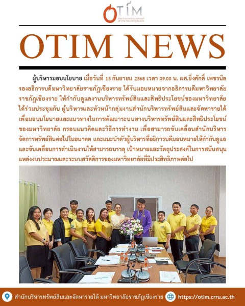 เมื่อวันที่ 15 กันยายน 2568 ผศ.ยิ่งศักดิ์ เพชรนิล รองอธิการบดีได้รับมอบหมายจากอธิการบดีมหาวิทยาลัยราชภัฏเชียงรายให้กำกับดูแลงานบริหารทรัพย์สินและสิทธิประโยชน์ของมหาวิทยาลัย ได้ร่วมประชุมกับผู้บริหารและหัวหน้ากลุ่มงานสำนักบริหารทรัพย์สินและจัดหารายได้ เพื่อมอบนโยบายและแนวทางในการพัฒนาระบบทางบริหารทรัพย์สินและสิทธิประโยชน์ของมหาวิทยาลัย กรอบแนวคิดและวิธีการทำงาน เพื่อสามารถขับเคลื่อนสำนักบริหารจัดการทรัพย์สินต่อไปในอนาคต และแนะนำตัวผู้บริหารที่อธิการบดีมอบหมายให้กำกับดูแลและขับเคลื่อนการดำเนินงานให้สามารถบรรลุเป้าหมายและวัตถุประสงค์ในการสนับสนุนแหล่งงบประมาณและระบบสวัสดิการของมหาวิทยาลัยที่มีประสิทธิภาพต่อไป