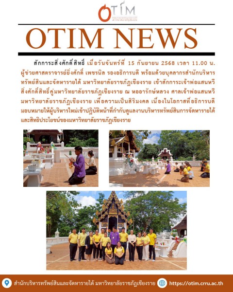 เมื่อวันจันทร์ที่ 15 กันยายน 2568 ผู้ช่วยศาสตราจารย์ยิ่งศักดิ์ เพชรนิล รองอธิการบดี พร้อมด้วยบุคลากรสำนักบริหารทรัพย์สินและจัดหารายได้มหาวิทยาลัยราชภัฏเชียงรายเข้าสักการะเจ้าพ่อแสนหวี สิ่งศักดิ์สิทธิ์คู่มหาวิทยาลัยราชภัฏเชียงราย ณ หออารักษ์หลวง ศาลเจ้าพ่อแสนหวีมหาวิทยาลัยราชภัฏเชียงราย เพื่อความเป็นสิริมงคลเนื่องในโอกาสที่อธิการบดีมอบหมายผู้บริหารเข้าปฏิบัติหน้าที่กำกับดูแลงานบริหารทรัพย์สินการจัดหารายได้ และสิทธิประโยชน์ของมหาวิทยาลัยราชภัฏเชียงราย