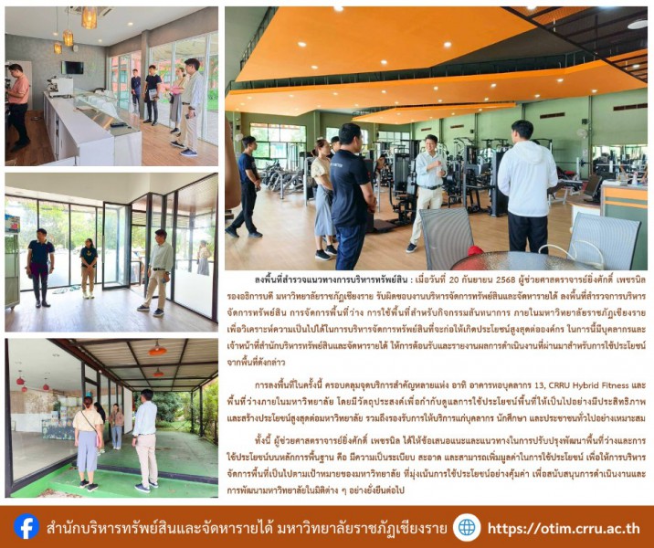 ในการนี้มีบุคลากรและเจ้าหน้าที่สำนักบริหารทรัพย์สินและจัดหารายได้ ให้การต้อนรับและรายงานผลการดำเนินงานที่ผ่านมาสำหรับการใช้ประโยชน์จากพื้นที่ดังกล่าว การลงพื้นที่ในครั้งนี้ ครอบคลุมจุดบริการสำคัญหลายแห่ง อาทิ อาคารหอบุคลากร 13, CRRU Hybrid Fitness และพื้นที่ว่างภายในมหาวิทยาลัย โดยมีวัตถุประสงค์เพื่อกำกับดูแลการใช้ประโยชน์พื้นที่ให้เป็นไปอย่างมีประสิทธิภาพ และสร้างประโยชน์สูงสุดต่อมหาวิทยาลัย รวมถึงรองรับการให้บริการแก่บุคลากร นักศึกษา และประชาชนทั่วไปอย่างเหมาะสม