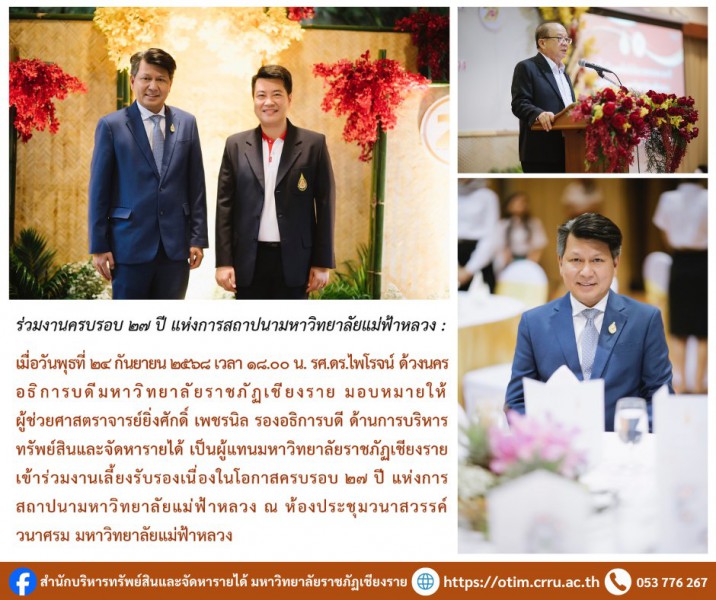 เมื่อวันพุธที่ 24 กันยายน 2568 เวลา 18.00 น. รศ.ดร.ไพโรจน์ ด้วงนคร อธิการบดีมหาวิทยาลัยราชภัฏเชียงราย มอบหมายให้ผู้ช่วยศาสตราจารย์ยิ่งศักดิ์ เพชรนิล รองอธิการบดี ด้านการบริหารทรัพย์สินและจัดหารายได้ เป็นผู้แทนมหาวิทยาลัยราชภัฏเชียงราย เข้าร่วมงานเลี้ยงรับรอง เนื่องในโอกาสครบรอบ 27 ปี แห่งการสถาปนามหาวิทยาลัยแม่ฟ้าหลวง ณ ห้องประชุมวนาสวรรค์วนาศรม มหาวิทยาลัยแม่ฟ้าหลวง