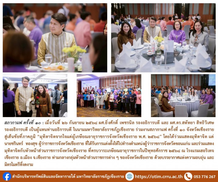 เมื่อวันที่ 26 กันยายน 2568 ผศ.ยิ่งศักดิ์ เพชรนิล รองอธิการบดี และ ผศ.ดร.สหัทยา สิทธิวิเศษ รองอธิการบดี เป็นผู้แทนท่านอธิการบดี ในนามมหาวิทยาลัยราชภัฏเชียงราย ร่วมงานสภากาแฟ ครั้งที่ 10 จังหวัดเชียงราย สู่เส้นชัยที่ภาคภูมิ "มุทิตาจิตจากใจแด่ผู้เกษียณอายุราชการจังหวัดเชียงราย พ.ศ. 2568" โดยได้ร่วมแสดงมุทิตาจิต แด่ นายชรินทร์ ทองสุข ผู้ว่าราชการจังหวัดเชียงราย ที่ได้รับการแต่งตั้งให้ไปดำรงตำแหน่ง ผู้ว่าราชการจังหวัดขอนแก่นและร่วมแสดงมุทิตาจิตกับหัวหน้าส่วนราชการจังหวัดเชียงรายที่ครบวาระเกษียณอายุราชการ ในปีพุทธศักราช 2568 ณ โรงแรมเฮอริเทจเชียงราย อ.เมือง จ.เชียงราย ท่ามกลางกลุ่มหัวหน้าส่วนราชการต่าง ๆ ของจังหวัดเชียงราย ด้วยบรรยากาศแห่งความอบอุ่น และมิตรไมตรีที่งดงาม